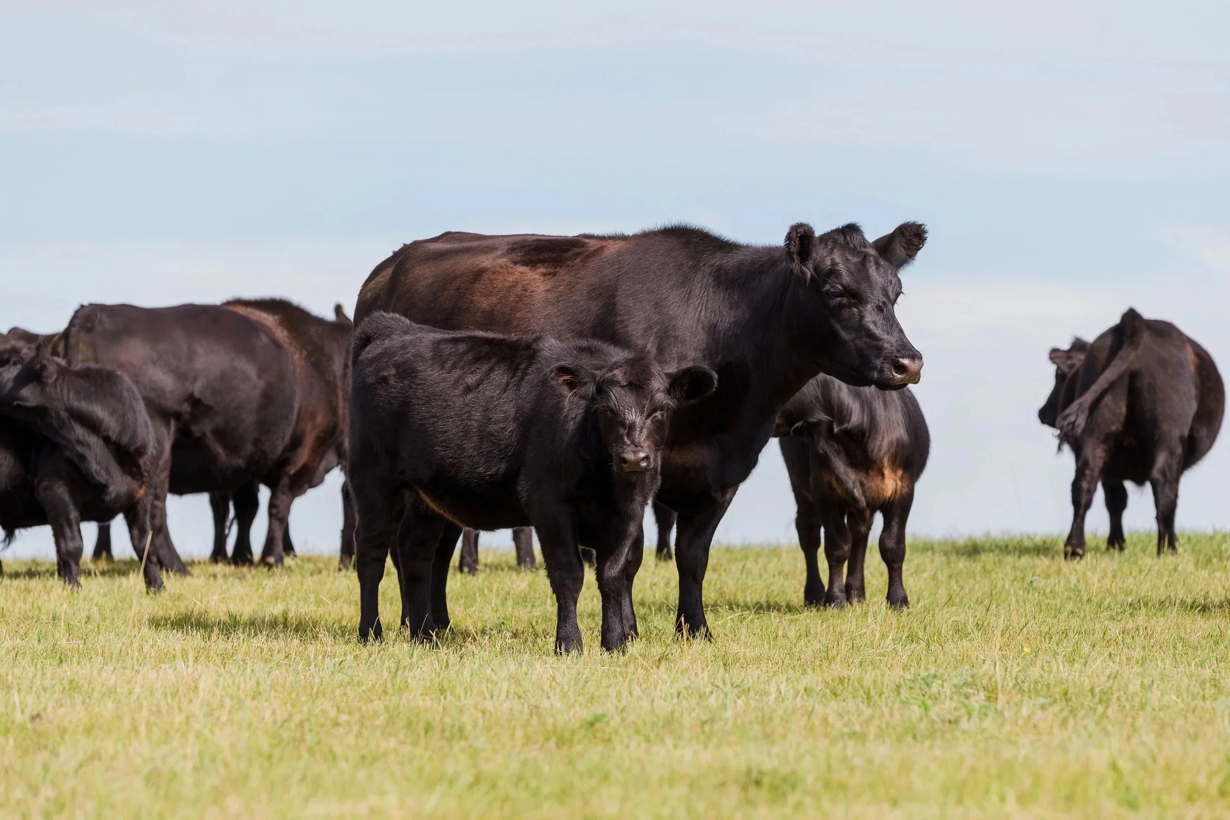 Lowline cattle are a moderate-framed breed developed from 100% Angus genetics, selected for their lower growth rates and compact size. Mature cows typically weigh between 850 and 1,100 pounds, while bulls range from 1,100 to 1,400 pounds. Known for their docile and gentle temperament, Lowlines are easy to handle, making them ideal for small farms or operations focused on low-stress management. They are highly efficient at converting grass into meat, requiring less feed and maintenance than larger breeds, and can produce more beef per acre. Carcass quality is exceptional, with tender, flavorful, and well-marbled beef, a high rib eye area per hundred pounds of body weight, and a high percentage of valuable cuts.